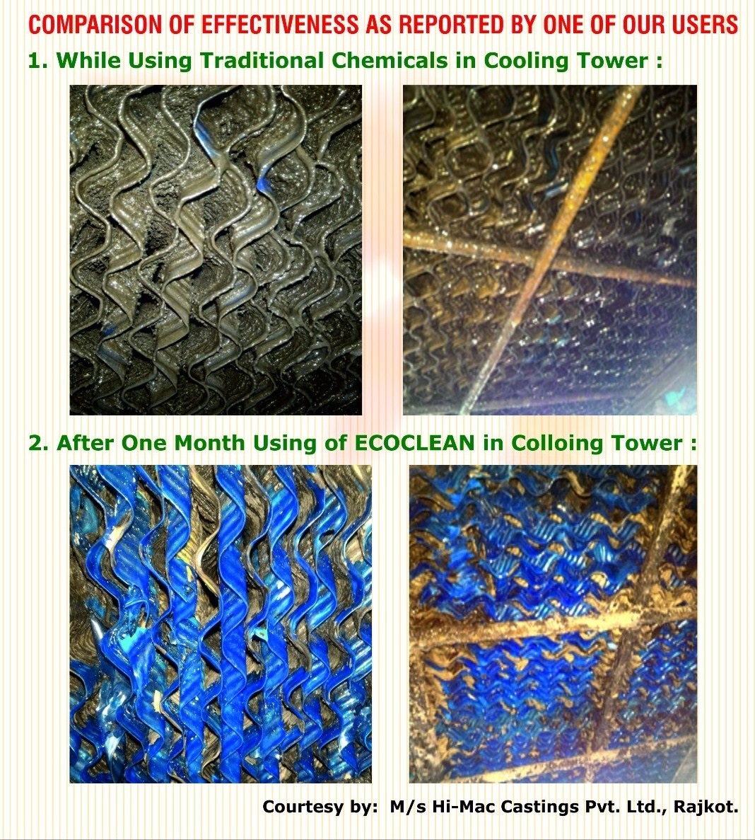8) Single solution to Multiple Problem:- ECOCLEAN is a single solution, for all the problem of cooling tower. ECOCLEAN acts as Anti-Bacterial, Anti-Fungal, Anti-corrosive, Anti-rusting & De-scaling agent.
