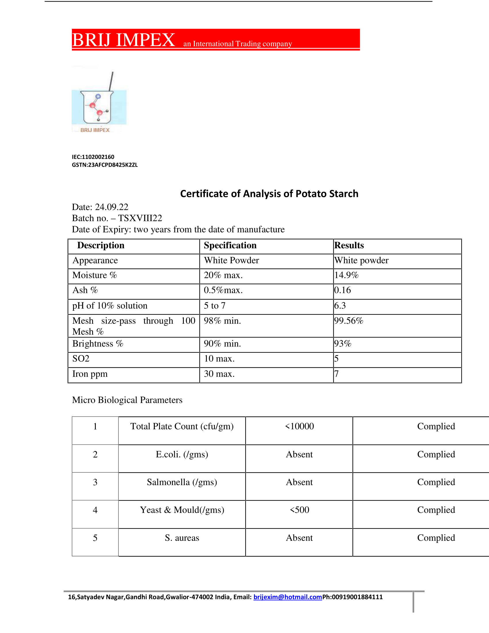 Potato starch is a refined starch, containing minimal protein or fat. This gives the powder a clear white colour, and the cooked starch typical characteristics of neutral taste, good clarity, high binding strength, long texture, and minimal tendency to foaming or yellowing of the solution.