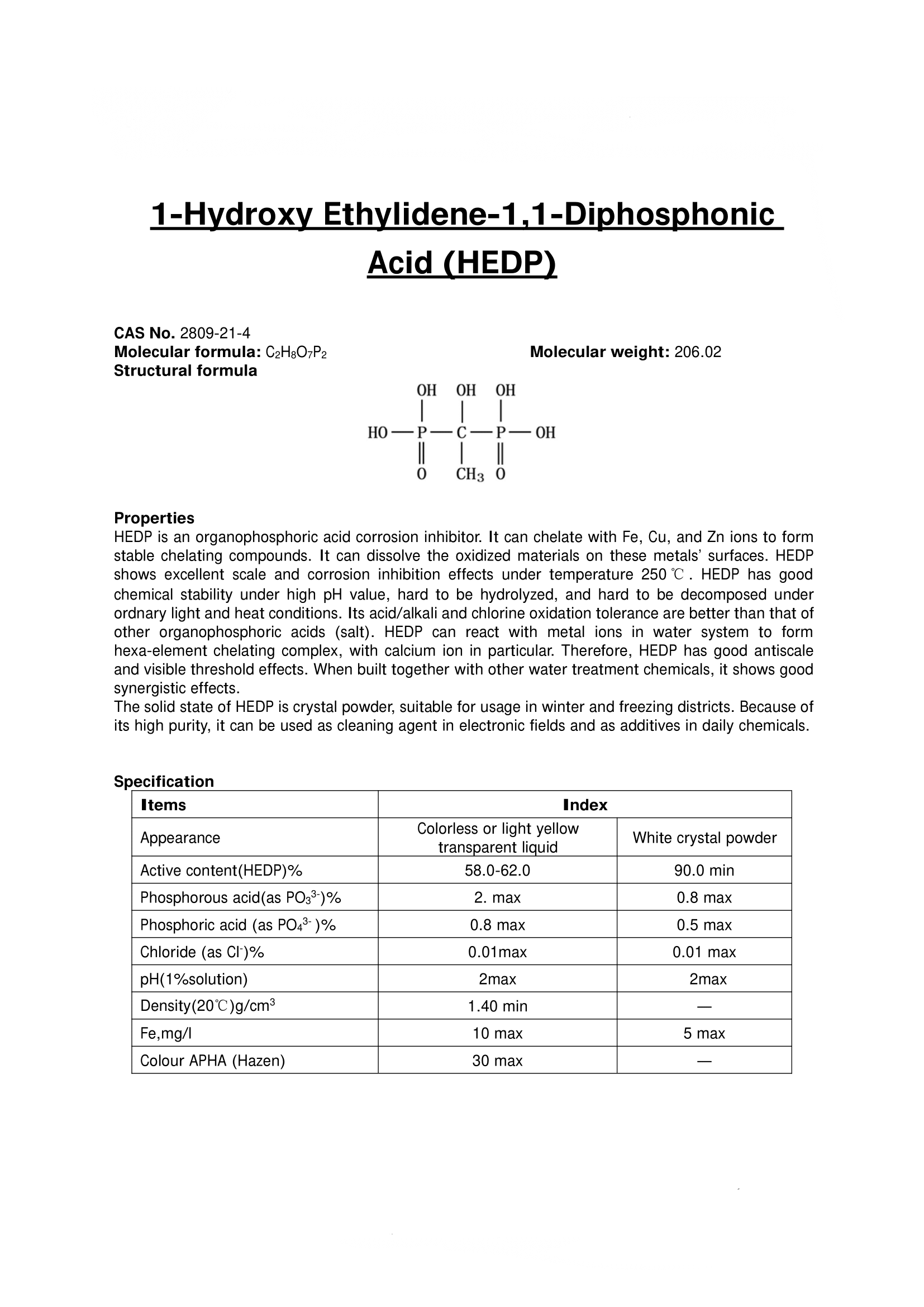 HEDP is used as scale and corrosion inhibition in circulating cool water system, oil field and low-pressure boilers in fields such as electric power, chemical industry, metallurgy, fertilizer, etc. In light woven industry, HEDP is used as detergent for metal and nonmetal. In dyeing industry, HEDP is used as peroxide stabilizer and dye-fixing agent; in non-cyanide electroplating, HEDP is used as chelating agent. The dosage of 1-10mg/l is preferred as scale inhibitor, 10-50 mg/l as corrosion inhibitor, and 1000-2000 mg/l as detergent. Usually, HEDP is used together with polycarboxylic acid.