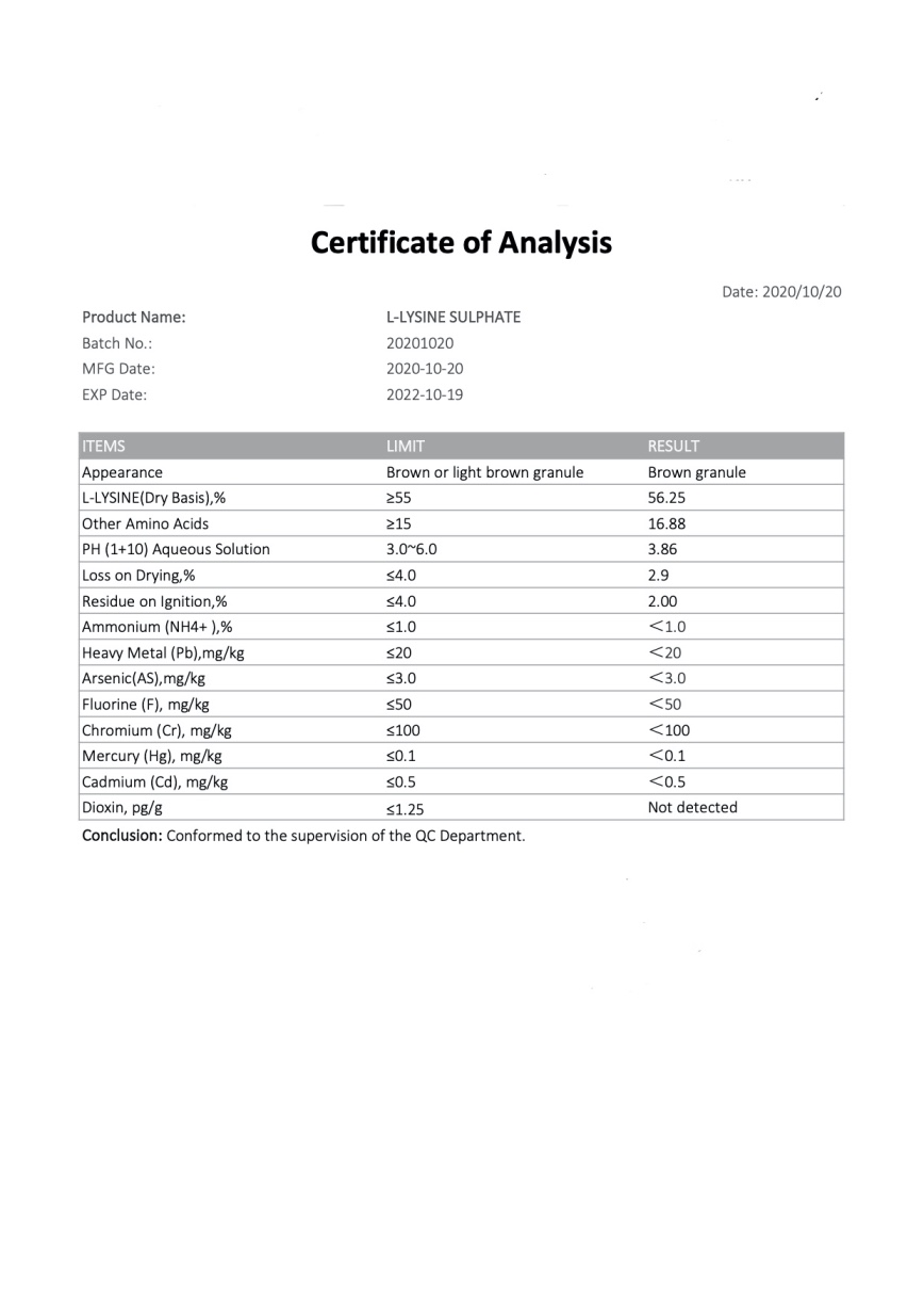 From various kinds of research results, Lysine sulphate is a kind of very good source for lysine. It is with remarkable application effect and biological effect in poultry, swine and aquatic livestock.